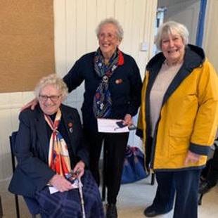 Eileen Palmer, joint chair of the county Trefoil Guild Team in Cornwall, presented Heather Marriott with her gold award for the Voyager challenge, and Heather and Valerie Ruse with Thank you badges for long service to guiding.