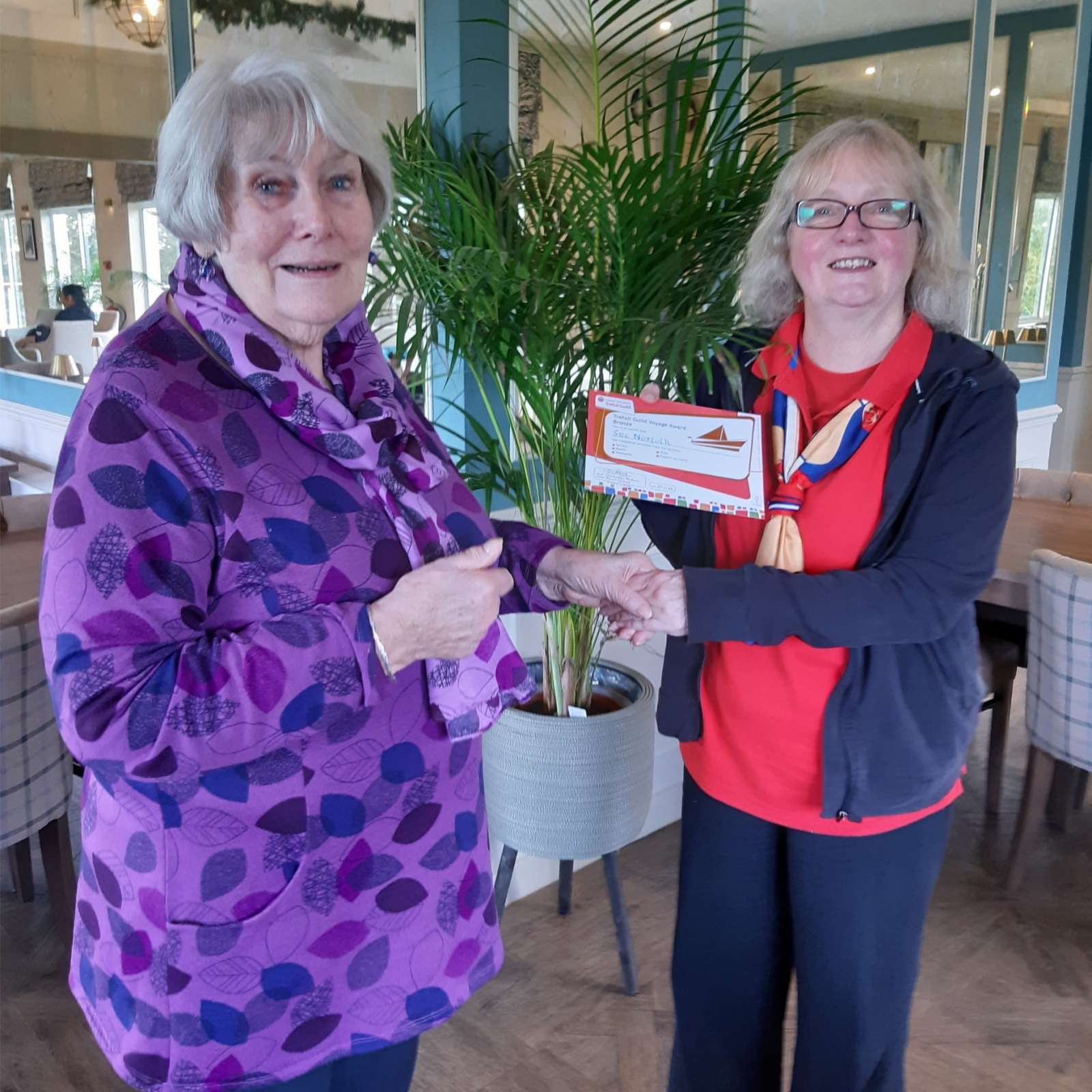 Eileen Palmer, joint Chair of Cornwall Trefoil Guild, presented Sue Norfolk, President of Cornwall Trefoil, with her bronze Voyage award at Truro Spires New Year Meal on January 7th 2025 at Truro Golf Club.