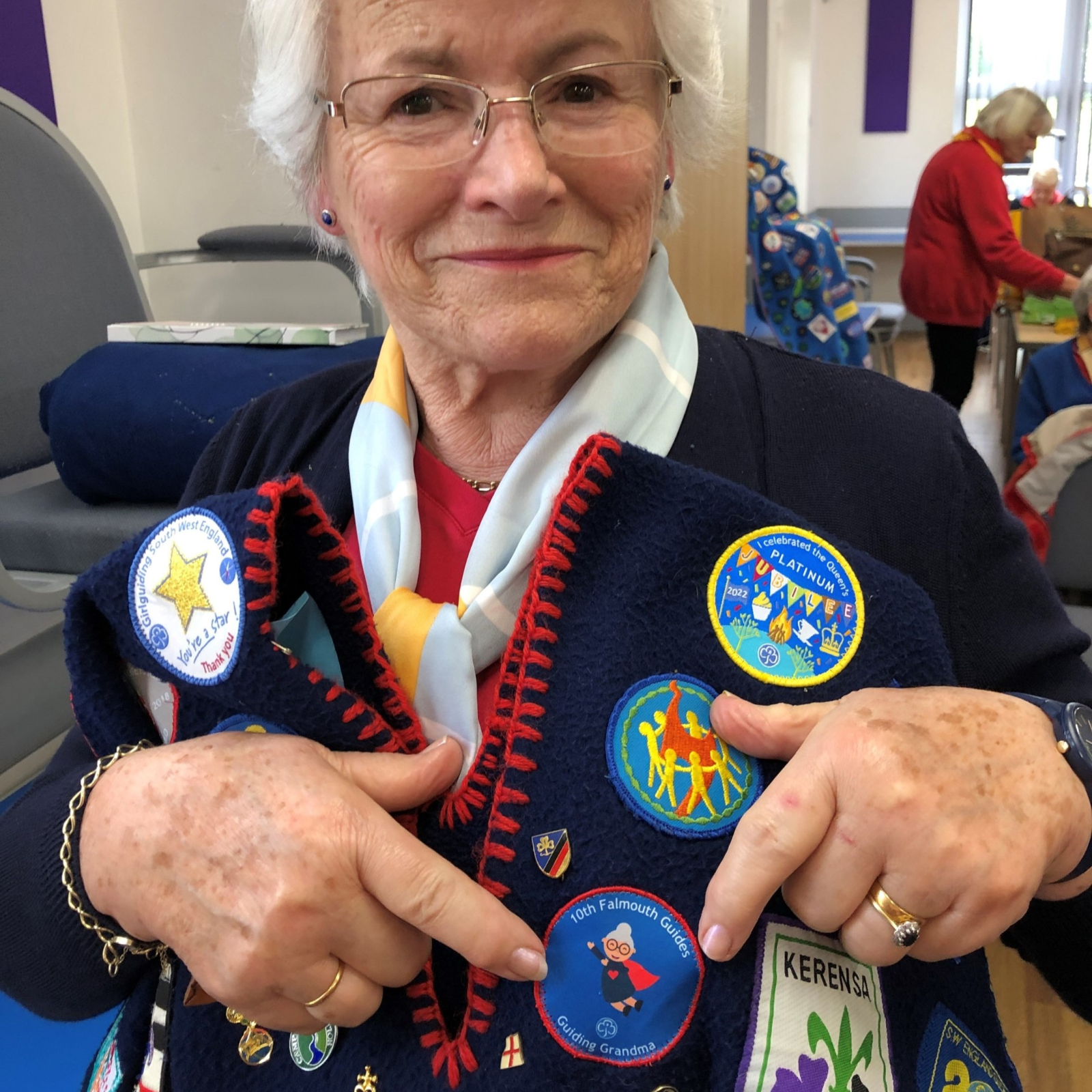 At the recent Cornwall Annual Review Meeting, where guilds displayed camp blankets from across the county, Jane Bennett from Falmouth guild proudly showed her personalised camp blanket badge, which was designed for her by 10th Falmouth Guides.