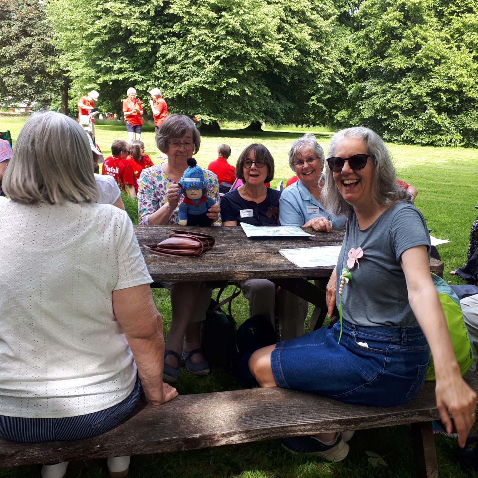 On Thursday 19th June over 100 Trefoilers from all over the South West gathered at Cotehele (National Trust) in Cornwall for a wonderful day of exploration and Trefoil activities. The sun shone all day, it was hot, but there were many trees in the beautiful grounds offering cool shade. Eight members of Ivybridge Trefoil went along to join the fun. I should say nine members, because of course we took Maggie June with us. She is our mascot, never misses a Trefoil outing and records them all, with photos, in her diary which she carries in a rucksack on her back. She was knitted by June Thompson, a member of many years ago. On June's death she was passed on to Maggie James, then on to Mavis Sturman who is her current guardian. We don't really know how old she is, but she has certainly outlived many members of today's Trefoil Guild.
