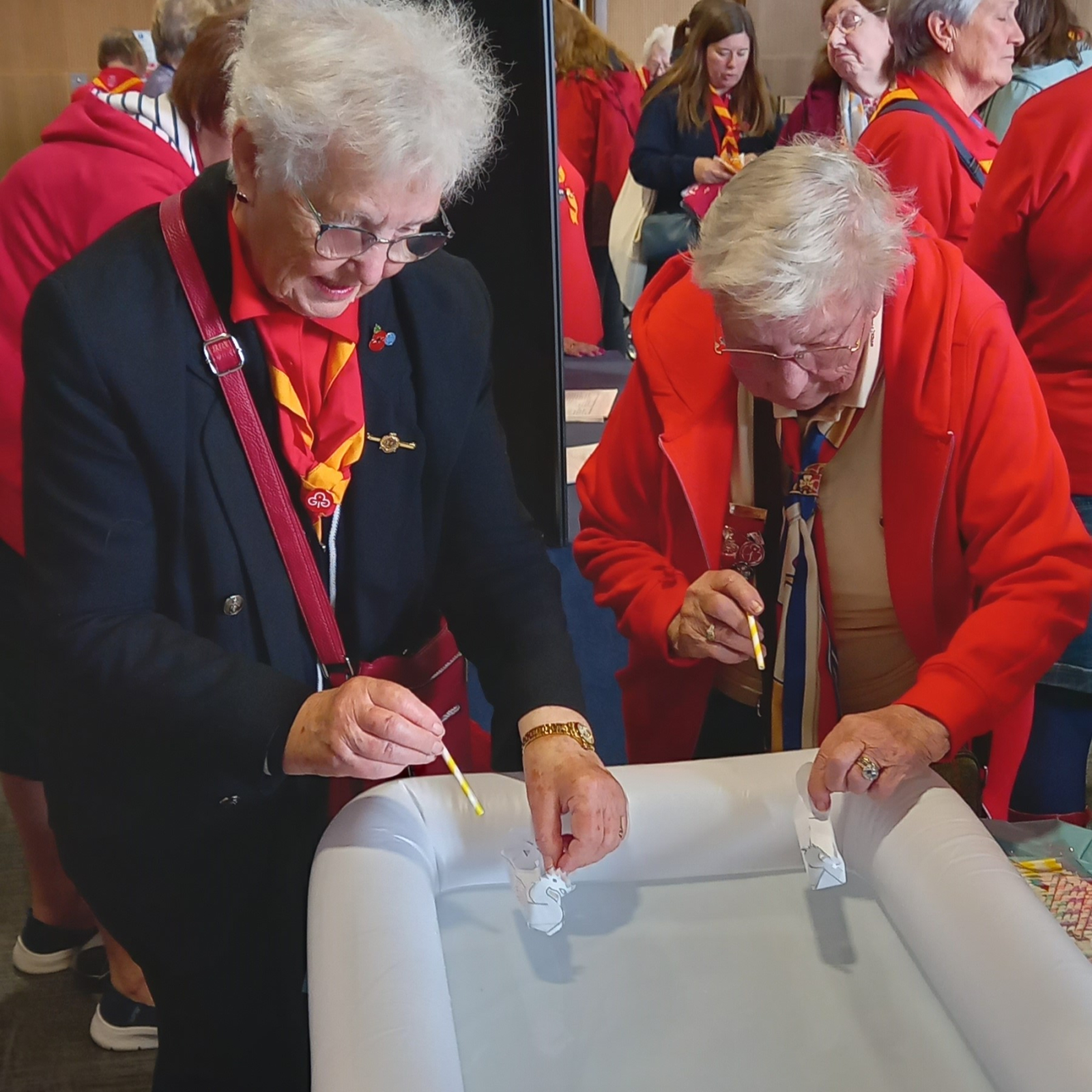 Making a paper boat, floating it in the 'pond' then using a straw to blow it to see who could get to the end first – Susan won.